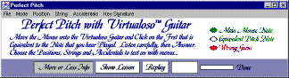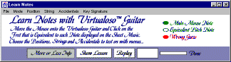 You may also click on the "Show Lesson" button, in order to see what notes you are going to be tested on and where they are on the Sheet Music and Virtualoso Guitar fretboard windows. The software doesn't keep track of your answers until you select "QUIZ..." on all six strings at once. Select the "Progress Report..." menu item under the "File" menu to review your progress.
