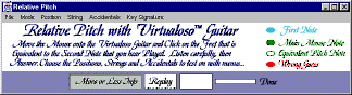 Learning relative pitch is accomplished via the "Relative Pitch" mode, under the "Mode" menu item. As described in the previous chapter we believe that relative pitch is extremely important to develop. In this mode, you select the position that you want to work on, the string combinations over which to test and the accidentals that you will be tested on. You enter your answers into the Virtualoso Guitar fretboard window.