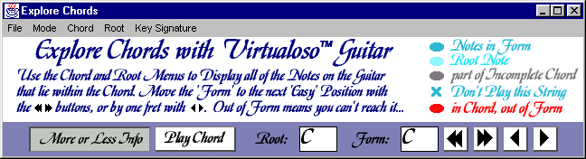 These "form" names take their name from the shape of the chord when it is in the open position. They are clearly displayed on the bottom of the Explore Chords window. This window provides you with a virtual chord calculator from which you can set and view any chord type.