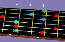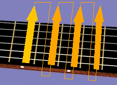 In the middle picture above, the Bar chord example, an "E" Major "form" bar chord is being