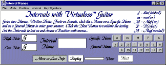 Learning intervals is accomplished via the "Interval Names", "Interval Notation", "Interval Frets" and "Interval Ear Training" modes. You will be entering your answers using the "Specific Name" and "General Name" buttons on the right side of the mode window. You will click on the "Next" button in order to initiate the next query.