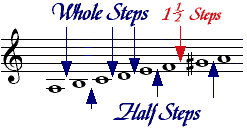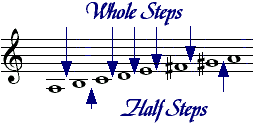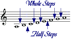 The smallest interval used in scales is a half step (or semitone). The next larger interval is a whole step, which is equal to two half steps. Using the natural notes, there are intervals of whole steps between C-D, D-E, F-G, G-A, A-B, and there are half steps between E-F and B-C. Return to the chapter on the Elements of Music Notation if this is unclear.