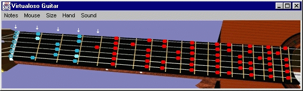 With your own guitar you can use Explore Scales mode as a virtual fretboard road map. Simply set the scale type that you want to work on, look at the notes on the Virtualoso Guitar window, and then play them on your own guitar. After you play the scale from a low tonic note up to the next tonic note, Hit the "Play Scale" button. Make sure it sounds the same as the scale you just played on your guitar.